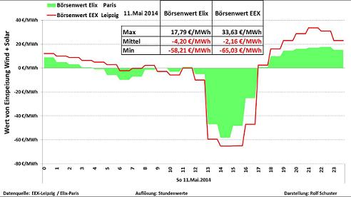 Abbildung 1: Am 11. Mai 2014 wurde in Deutschland Strom wegen der chaotischen Überproduktion aus Wind- und Solaranlagen mit Geldgeschenken bis zu 65 € pro MWh in die in- und ausländischen Märkte gedrückt – nichts anderes als frühkolonialistisches Dumping (Grafik: Rolf Schuster)