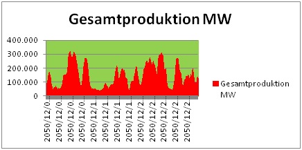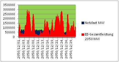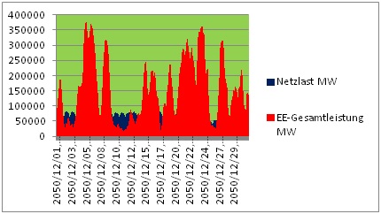 Um die konkreten Auswirkungen des beschlossenen Ausbaus von Wind- und Solarstromerzeugung im Jahre 2050 zu veranschaulichen, wurden die realen Zahlen der Stromproduktion des Dezembers 2013 in viertelstündlicher Auflösung zugrunde gelegt. Dann wurden sowohl die vollständige Netzlast als auch die zu erwartende Leistungsbereitstellung durch Wind- und Solarkraftwerke mit Hilfe der oben aufgeführten Zahlen umgerechnet. Abbildung 3 zeigt die entsprechenden Werte für die Netzlast (entspricht in etwa dem inländischen Verbrauch) sowie für die Summenleistung von Wind- und Solarenergieanlagen plus Wasserkraft. Der Spitzenwert liegt bei 296.000 MW.