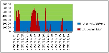 Abbildung 4: Im fiktiven Dezember 2050 benötigte Leistung aus konventionellen Kraftwerken: Rot für die Tage, an denen die Produktion aus EE-Quellen nicht zur Deckung der Netzlast ausreicht, und blau die zur Aufrechterhaltung der Netzsicherheit erforderliche Mindestleistung