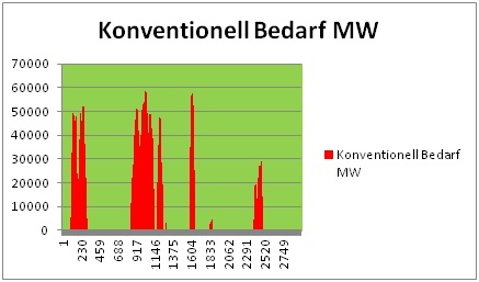 Wer beim Blick auf diese Darstellung jetzt annimmt, man könne angesichts der großen Mengen an EE-Strom die Kapazität der konventionellen Kraftwerke stark reduzieren, den wird ein Blick auf Abbildung 4 enttäuschen. Trotz der riesigen Kapazitäten von Wind- und Solarenergieanlagen gibt es weiterhin häufig kürzere oder auch längere Zeiträume, in denen konventionelle Kraftwerke einspringen müssen, weil die Produktion von EE-Strom nicht ausreicht, um Deutschland zu versorgen. In der Spitze müssen konventionelle Kraftwerke bis zu 61.000 MW Leistung bereitstellen, damit die Stromversorgung gesichert bleibt. Darüber hinaus müssen zahlreiche Kohle- und Gaskraftwerke sogar kontinuierlich am Netz bleiben, um die Mindestleistung von etwa 28.000 MW zu sichern, die benötigt wird, um die zur Stabilisierung des Netzes erforderliche Regelleistung darstellen zu können.