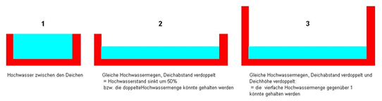 Wenn in Hitzacker an der Elbe der Pegel von 3m auf 7,5m steigt [1], dann erhöht diese Wassermenge später im Hamburger Hafen den Pegel nur um ca. 40cm und in Freiburg (Elbe) hat noch nie ein Flusshochwasser aus dem Binnenland den Elbpegel tangiert. Denn: je breiter der Fluss wird, umso niedriger steigt das Hochwasser. An der Niederelbe (bei Freiburg/Elbe etc.) stehen zwar die höchsten Elbdeiche, aber nicht wegen eines Hochwassers, das die Elbe herunter kommt, sondern wegen der Nordsee, die bis hinter Hamburg eine Flut in das Land drücken kann. Schon vor Hamburg wird die Elbe so breit, dass es im Hafen keine Elbhochwasserschäden geben kann. Aber nicht jeder Fluss hat so viel Platz wie die Elbe in Hamburg. Leider wurden viele Flüsse stark eingezwängt. Lässt sich aber korrigieren. Verdoppele ich den Abstand der Deiche links und rechts, sinkt das Hochwasser um die Hälfte, hat doppelt so viel Wasser Platz. Verdoppele ich den Abstand der Deiche und verdoppele ich die Deichhöhen, kann die vierfache Wassermenge zwischen den Deichen durchfließen. Das ist einfach zu verstehen, aber man kann daraus auch eine Ideologie machen: „Gebt den Flüssen ihre Überschwemmungsgebiete von damals zurück“. Und schon sollen die Menschen nicht mehr vor dem Hochwasser geschützt werden, sondern das Hochwasser vor den Menschen. Der Naturschutzbund Deutschland fordert aktuell mindestens 500.000 Hektar landwirtschaftlicher Fläche wieder in Auwaldzonen zu verwandeln. [2] Zum Vergleich: Der Bodensee hat 53.600 Hektar. Es geht also darum Landwirtschaftsflächen mindestens in der 10-fachen Größe des Bodensees zu renaturalisieren.