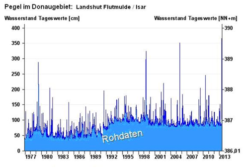 Wie in der Grafik ersichtlich, war das letzte Hochwasser ein Rekordhochwasser, aber in normalen Zeiten ist die Landshuter Flutmulde ein schöner Park mit einem kleinen Bach aus Isarwasser darin.