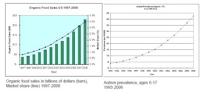 Der linke Graph zeigt Umsätze bei Bio-Lebensmitteln. Der rechte Graph zeigt Fälle von Autismus. Der Graph unten zeigt den Anstieg bei Diabetes. Ganz klar eine Verbindung!