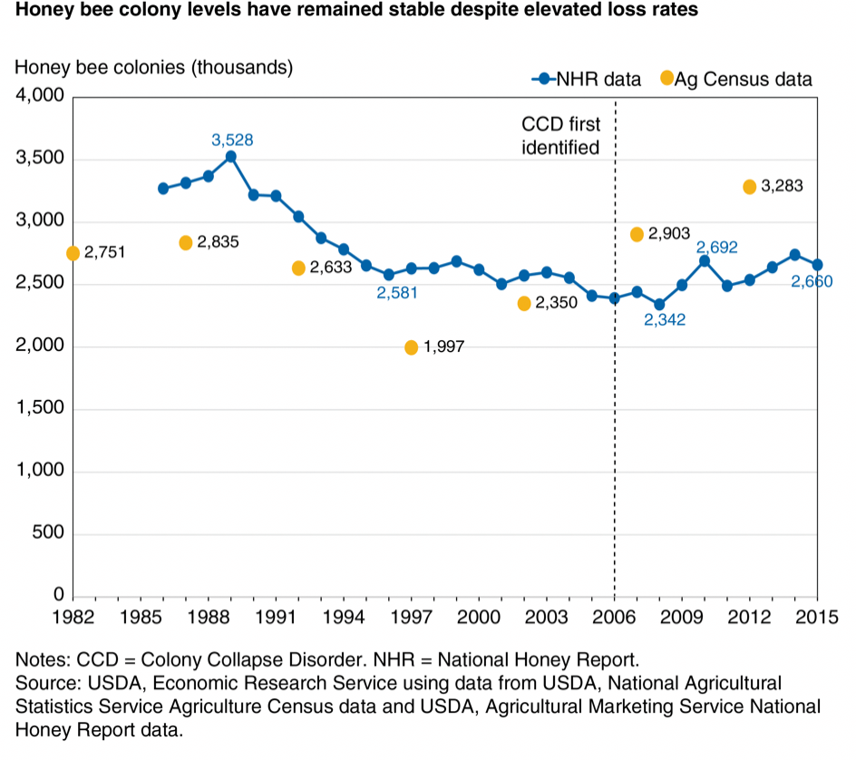 Trotz eines leichten Rückgangs der Zahlen für einige Jahre während der CCD-Krise haben sich die Honigbienenvölker in den USA schnell erholt und zeigen seit 2011 eine bemerkenswerte Stabilität, die sogar eine deutliche Zunahme gegenüber der Zeit vor den Neonics mit sich brachte. Aber Interessengruppen, deren Krisenerzählung von einer aggressiven Gruppe von für ihren Umweltaktivismus bekannten Wissenschaftlern verstärkt wird (Paradebeispiel ist der britische Biologieprofessor David Goulson), wollen nichts davon wissen. Sie gingen daher einer differenzierten Betrachtung der Bienengesundheits-Frage aus dem Wege und entfachten stattdessen einen Tsunami von hysteriegetriebenen Nachrichten, die dem Stand der Wissenschaft nicht gerecht wurden und zur Bewältigung einer Krise, die so komplex wie die Bienengesundheit ist, nichts beitragen.
