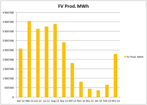 Bild 1: Solarstromproduktion in Deutschland im Zeitraum von April 2012 bis März 2013 in MWh (Datenquelle: EEX)