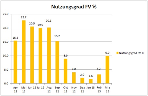 Bild 2. Monatliche Nutzungsgrade der in Deutschland installierten Fotovoltaikanlagen im Zeitraum April 2012 bis März 2013