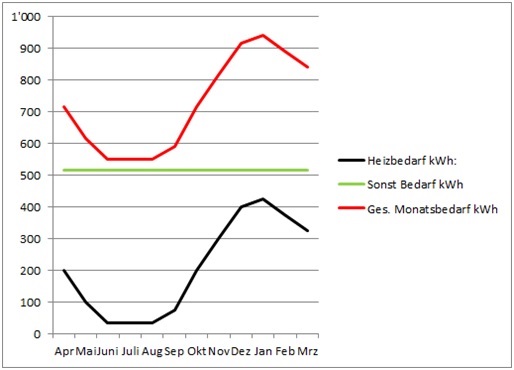 Unsere hypothetische Test-Inselfamilie Mustermann besteht aus Vater, Mutter und zwei fast erwachsenen Kindern und lebt in einer Doppelhaushälfte, die nach heutigem Standard gedämmt ist. Als Beitrag zum Klimaschutz verzichtet man auf fossile Energieträger wie Öl oder Gas und hat stattdessen eine elektrische Warmwasserbereitung sowie eine moderne Wärmepumpenheizung. Mustermanns verbrauchen jährlich die für einen solchen 4P-Haushalt typische Strommenge von 6190 kWh [1] und für die Wärmepumpenheizung zusätzlich nochmals 2500 kWh, macht zusammen 8690 kWh. Während man beim normalen Stromverbrauch in erster Näherung einen konstanten Verlauf über das Jahr hinweg annehmen kann, hängt der Strombedarf der Heizung natürlich von der Jahreszeit bzw. von den Außentemperaturen ab. Im vorliegenden Fall wird davon ausgegangen, dass sich Mustermanns auch hierbei mustergültig verhalten und die entsprechende Strombedarfskurve der üblichen Berechnung mittels Gradtageszahlen nach VDI 2067 entspricht. Den sich aus diesen Betrachtungen ergebenden Jahresverlauf des Stromverbrauchs zeigt Bild 3.