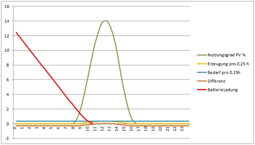 Bild 4. Simulation des Verlaufs von FV-Erzeugung, Nutzungsgrad, Strombedarf und Batterieladung in 15-min Schritten am 1. Januar 2013. An diesem Tag lag der Nutzungsgrad der Solaranlage bei 2,6 %, deutlich besser als der Monatsdurchschnitt von 1,6 %.