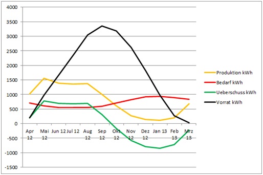 Bild 5. Simulation von Solaranlage und Batterien im Saisonspeicherbetrieb mit für Deutschland zwischen April 2012 und März 2013 ermittelten Solardaten